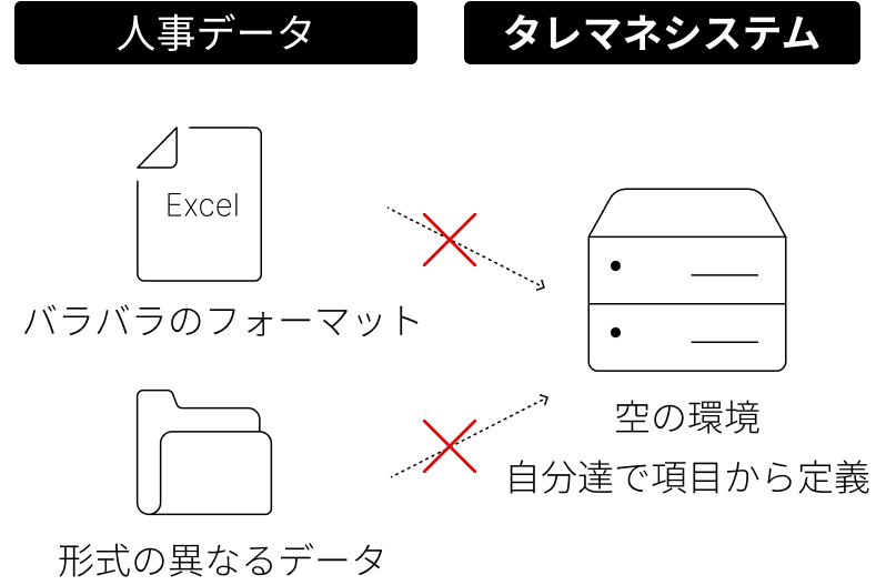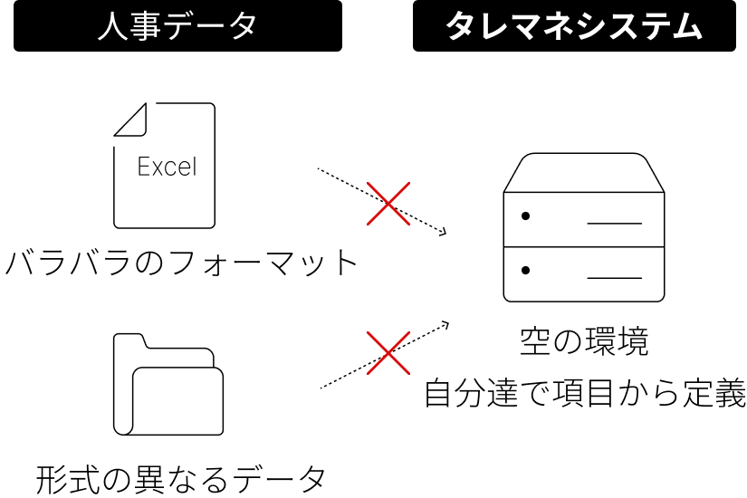 入れたい人事データはあっても、データによってフォーマットがバラバラだったりするなど、設定前の作業が膨大なことが多い。