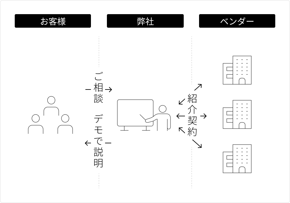 お客様の実現したいことを踏まえ、最適なシステム選定を支援します。弊社が窓口になることで、よりリアルな情報でシステム選定ができ、同時に各ベンダーとのコミュニケーションが最小限となります。