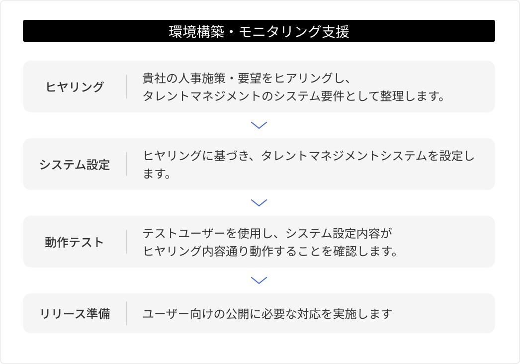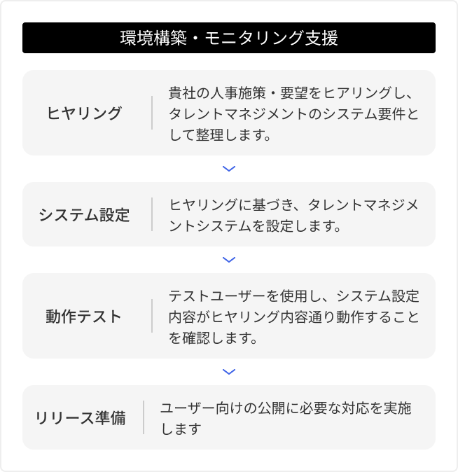 タレントマネジメントシステムの項目や権限の設定、評価表の実装を行います。データ活用や可視化を視野に入れた使い勝手が良く、運用しやすい環境構築を行っています。