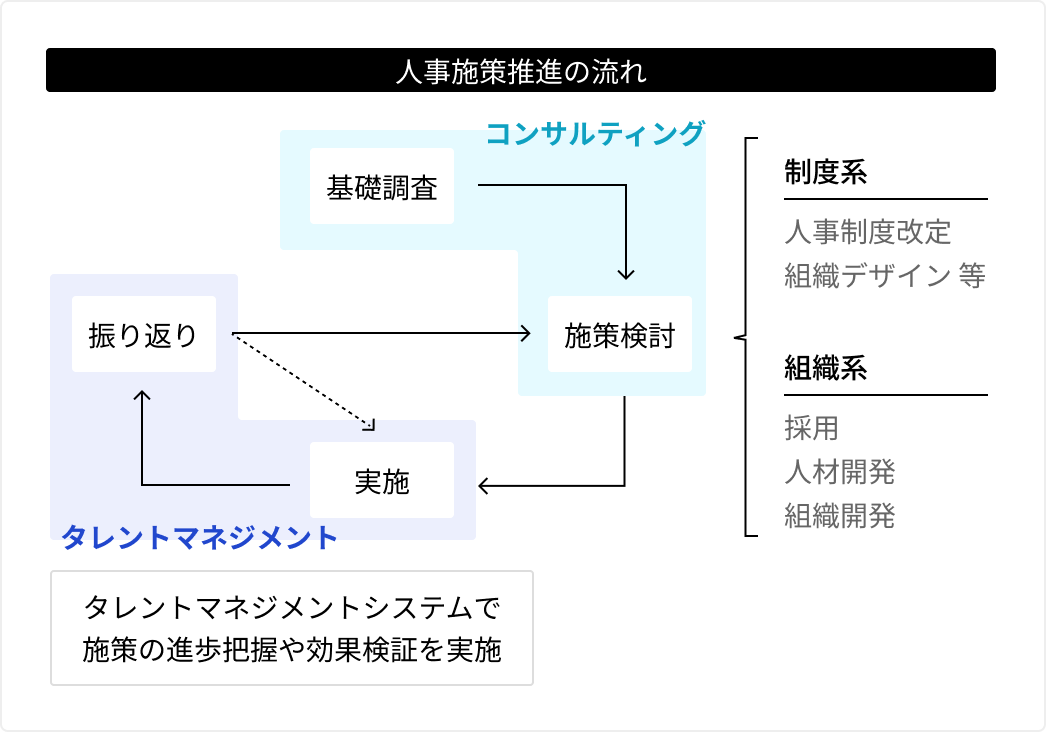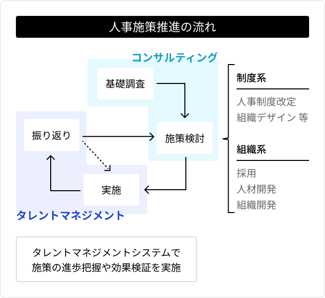 タレントマネジメントシステムを活用した人事施策の企画から実装まで、コンサルタントが伴走しながらご支援します。